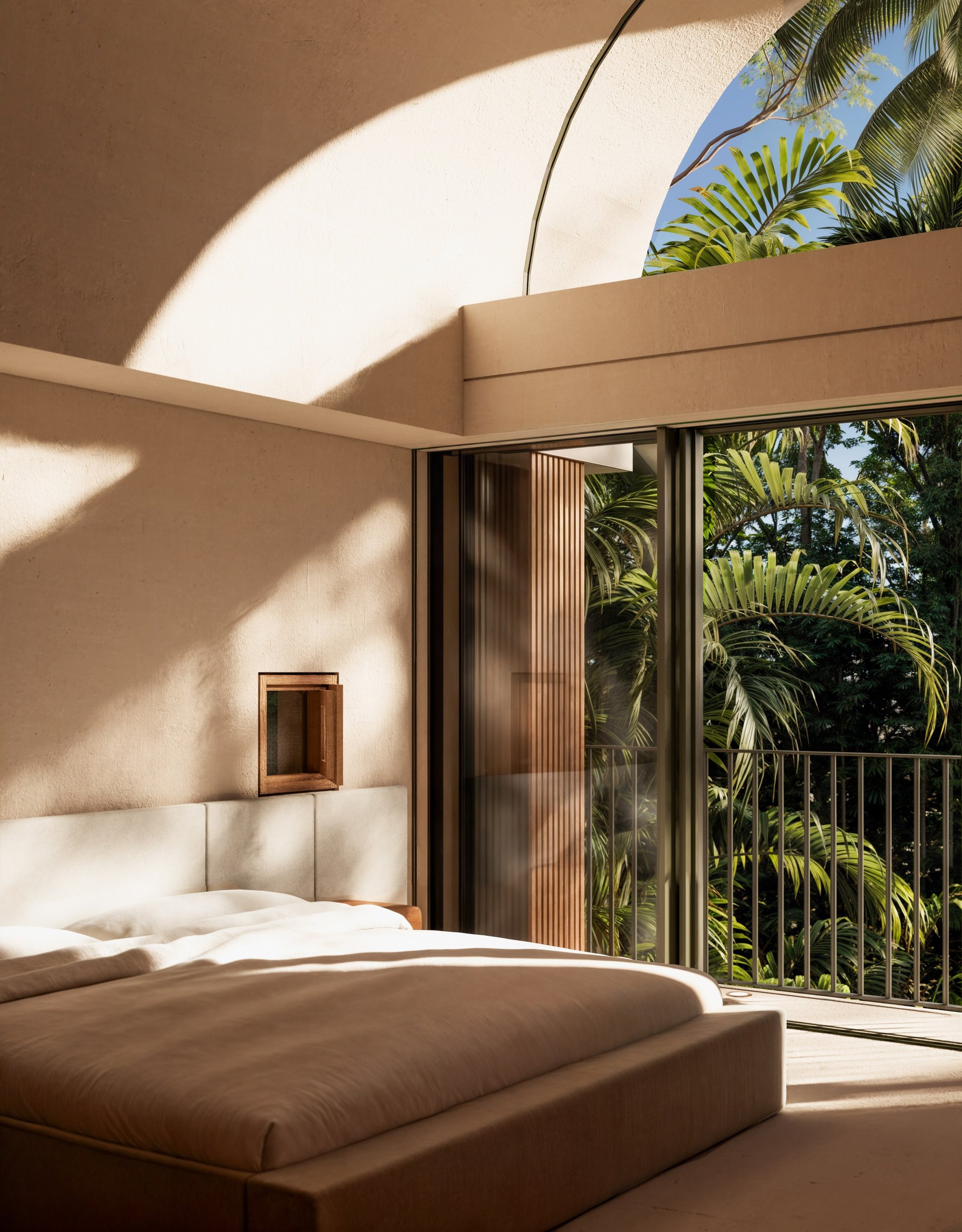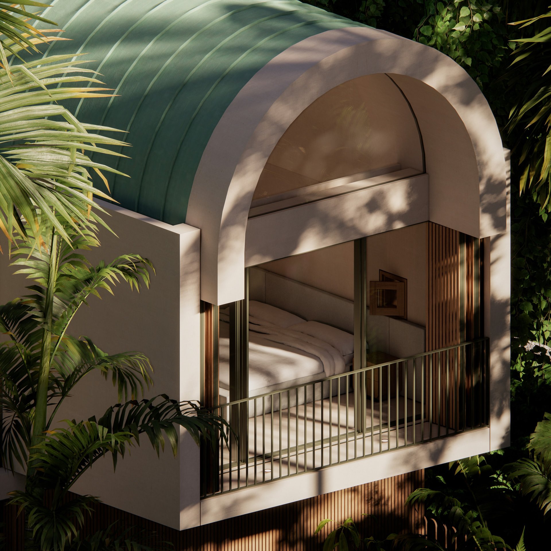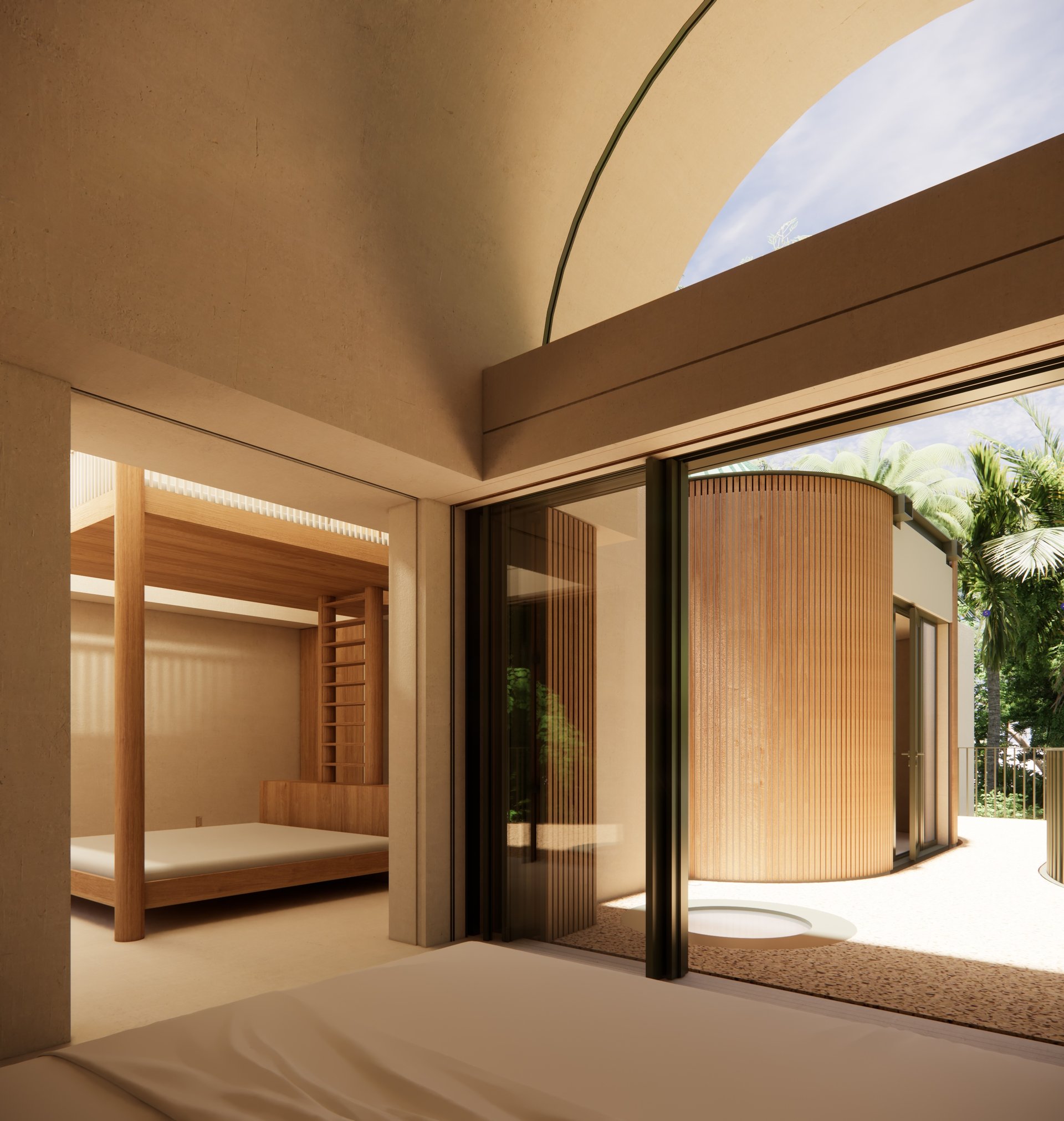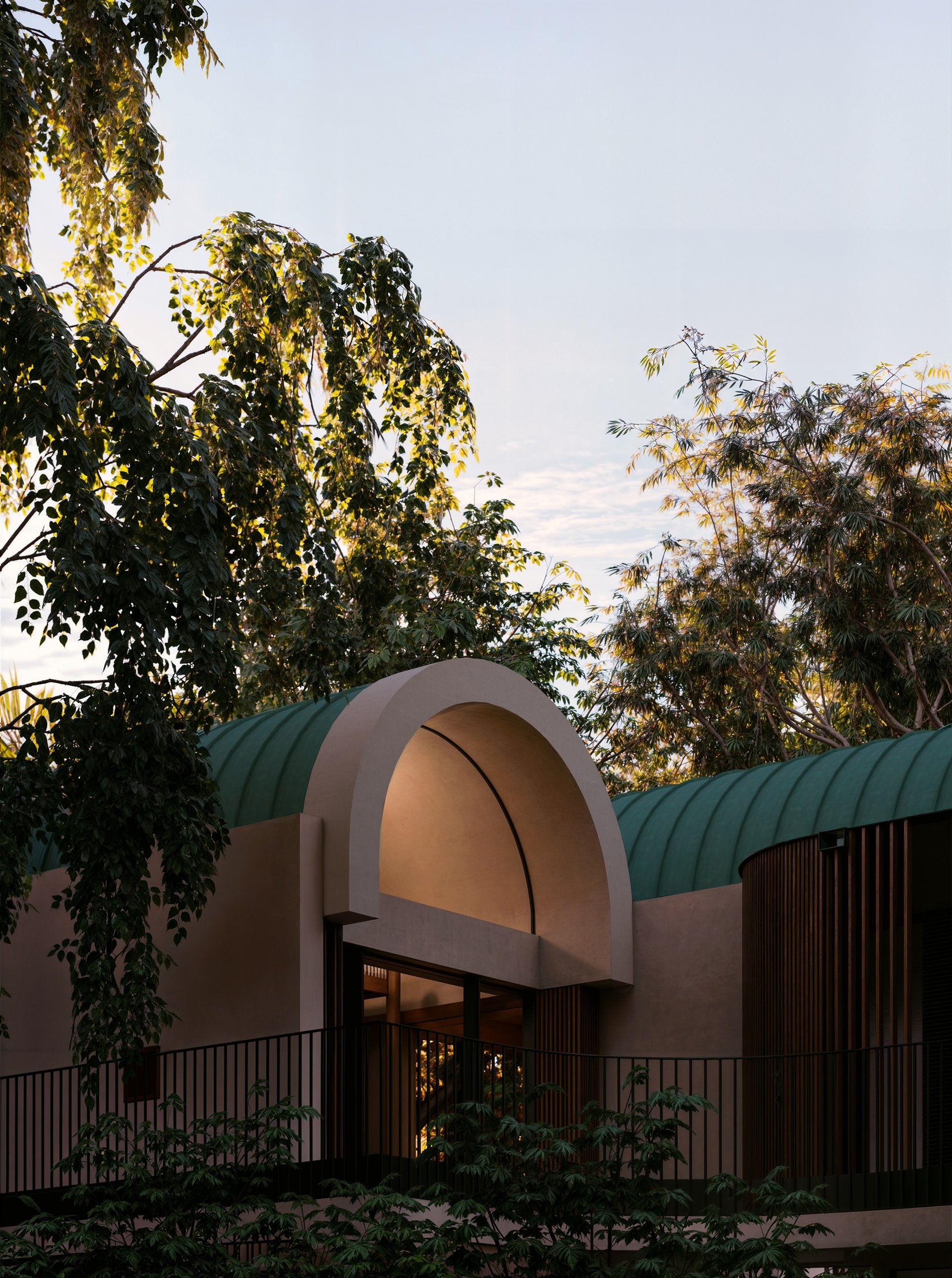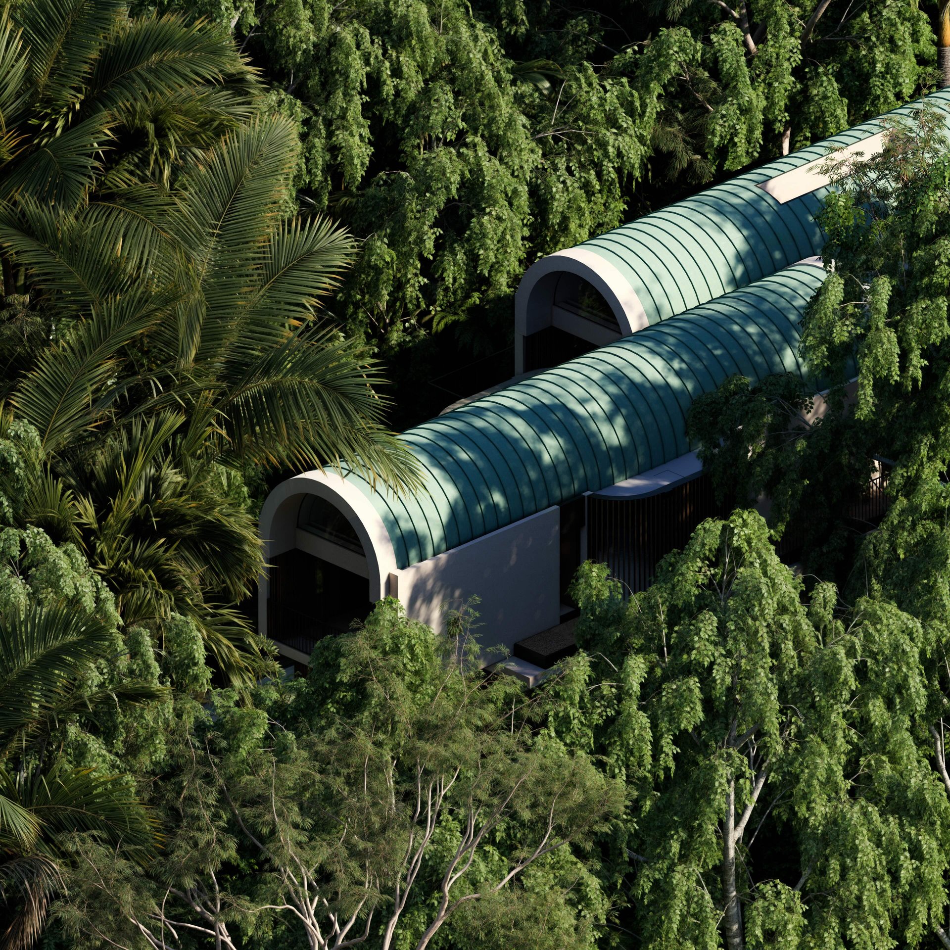 The rootball radius and canopy spread has introduced arced courtyards to the plan and barrel-shaped roofs to the building section.
