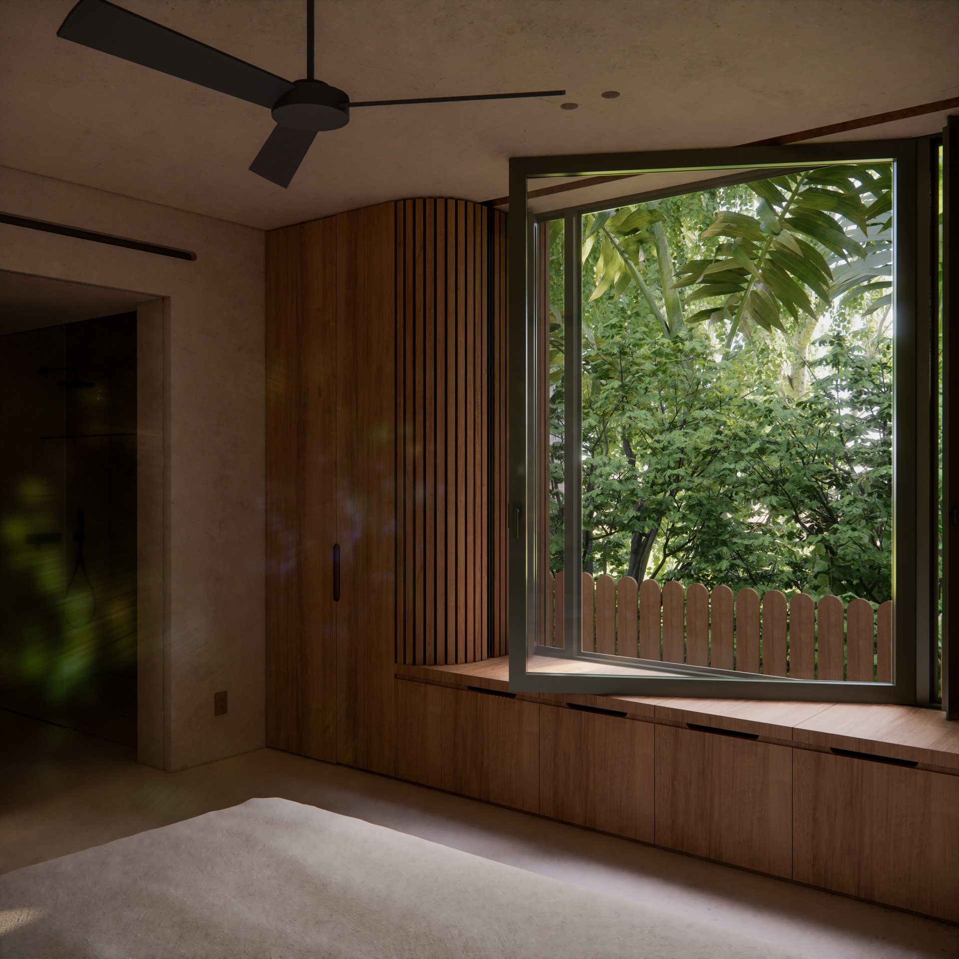 Palmetto House is located in the Coconut Grove district of Miami, Florida. It is Miami’s oldest neighbourhood and has a laid-back and bohemian charm. Banyan trees, palms and live oaks line the quiet residential streets, where peacocks are seen roaming wild. Our client’s site embodies all these characteristics in microcosm, with an array of established sub-tropical plants present on the site. We wanted to ensure our design preserved and respected as many of the site’s mature trees as possible.