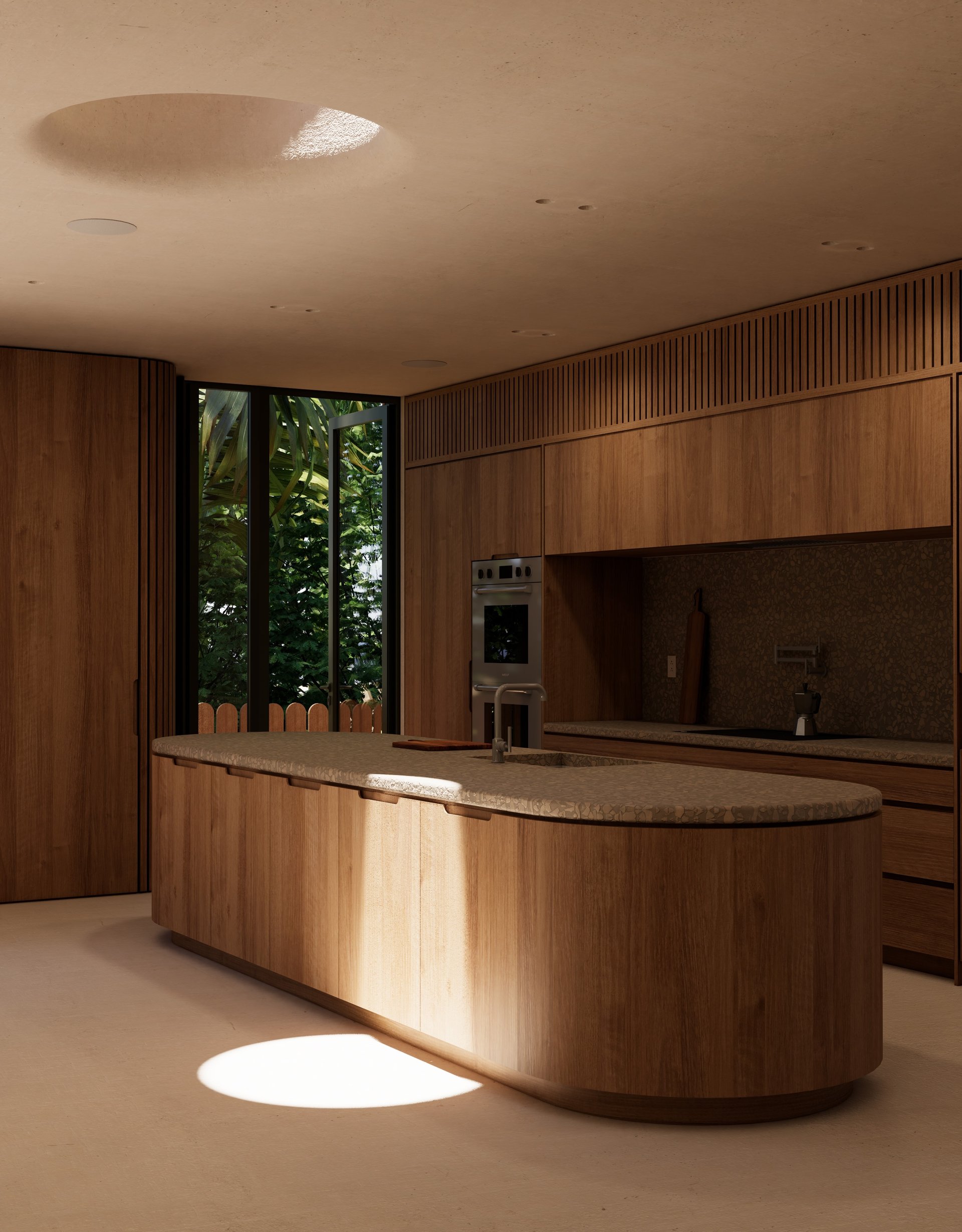 We have designed a home that is literally shaped by trees. The root ball radius and canopy spread has introduced arced courtyards to the plan and barrel-shaped roofs to the building section. As a result we have created a home that sits up-close to nature without disturbing it. Level one optimises the maximum building width and depth of the site (with the exception of the two arced courtyards), whilst level two features two separated vaulted volumes (one pushed toward the road and the other to the garden), that allows optimum space for the tree canopies to spread.