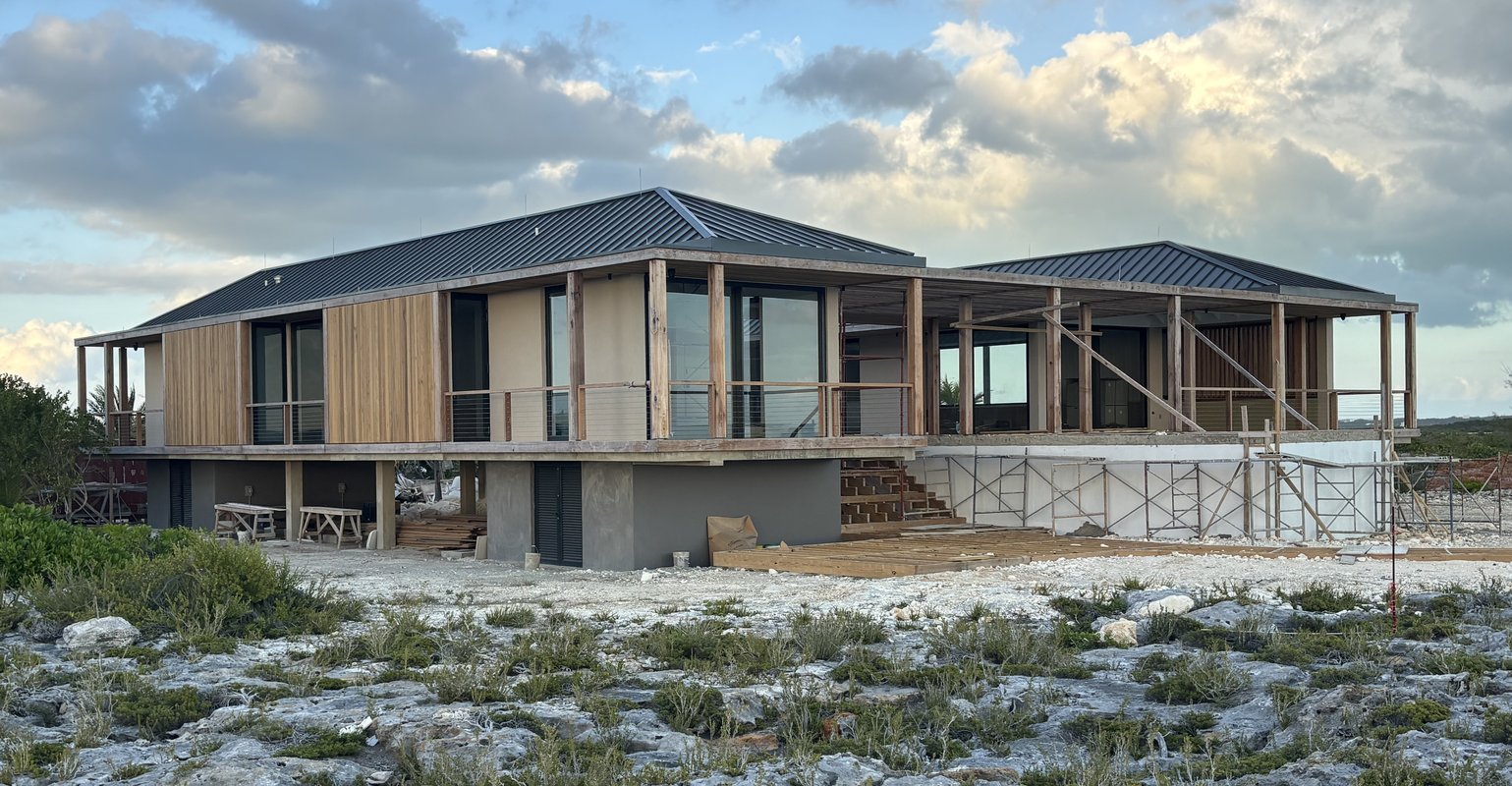 Our Hill House project is in the final month of construction! The profile of the mono-pitched home can now be fully appreciated against the hillside. We designed the home to be shaped in a 'wind-pruned' fashion, leaning back from the prevailing winds and providing a place of calm refuge on the wilder side of Providenciales.