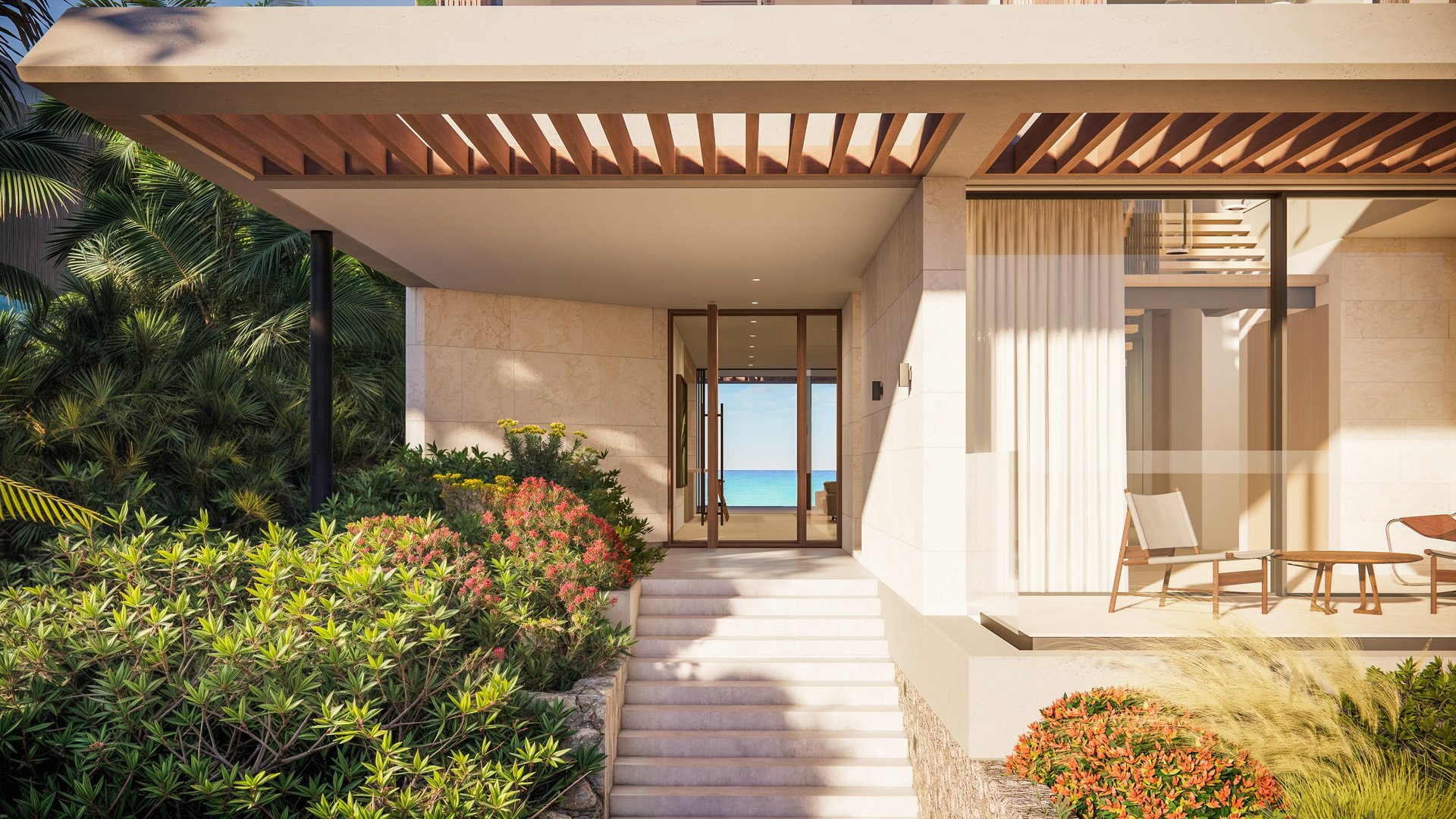 We have created a tiered profile to the villas in both directions. They lean back from the ocean in a ‘wind-pruned’ manner, which gives them a quiet repose, and enhanced privacy from the beach. We also tapered the floor slabs to express the wide proportions of the villas whilst accentuating their stealthlike ‘superyacht’ profiles.