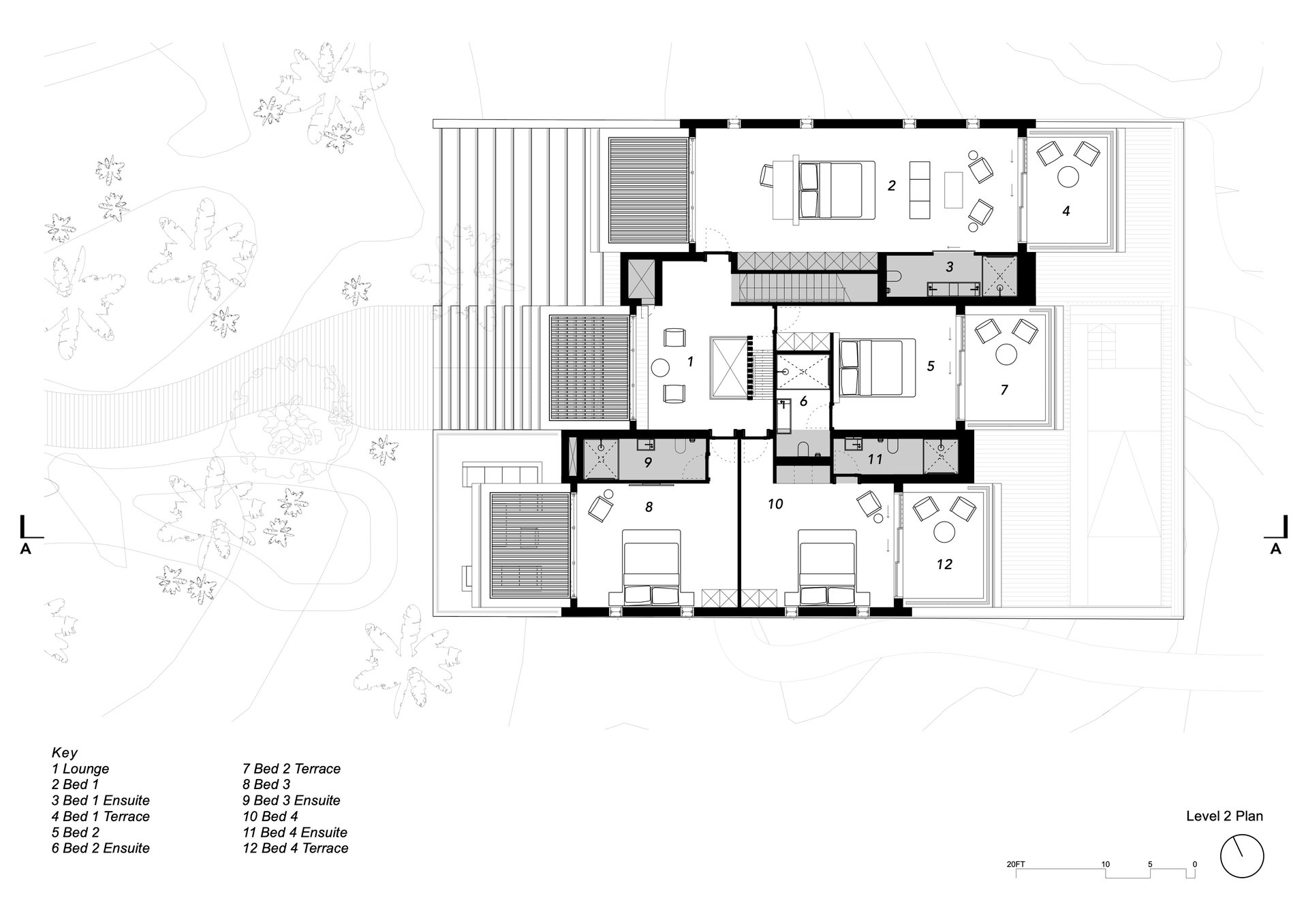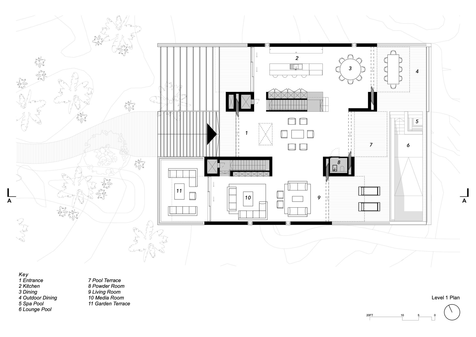 into a spectacular central living area that gives expansive views out to the ocean. Kitchen, living, and dining areas interconnect on this level and lead out onto the pool terraces. At the top level, four bedrooms step to give privacy and shelter, their operable windows allowing precise natural ventilation control. Each of the bedrooms has a large shaded balcony, providing maximum sun protection and a dramatic framing of views across the bay.