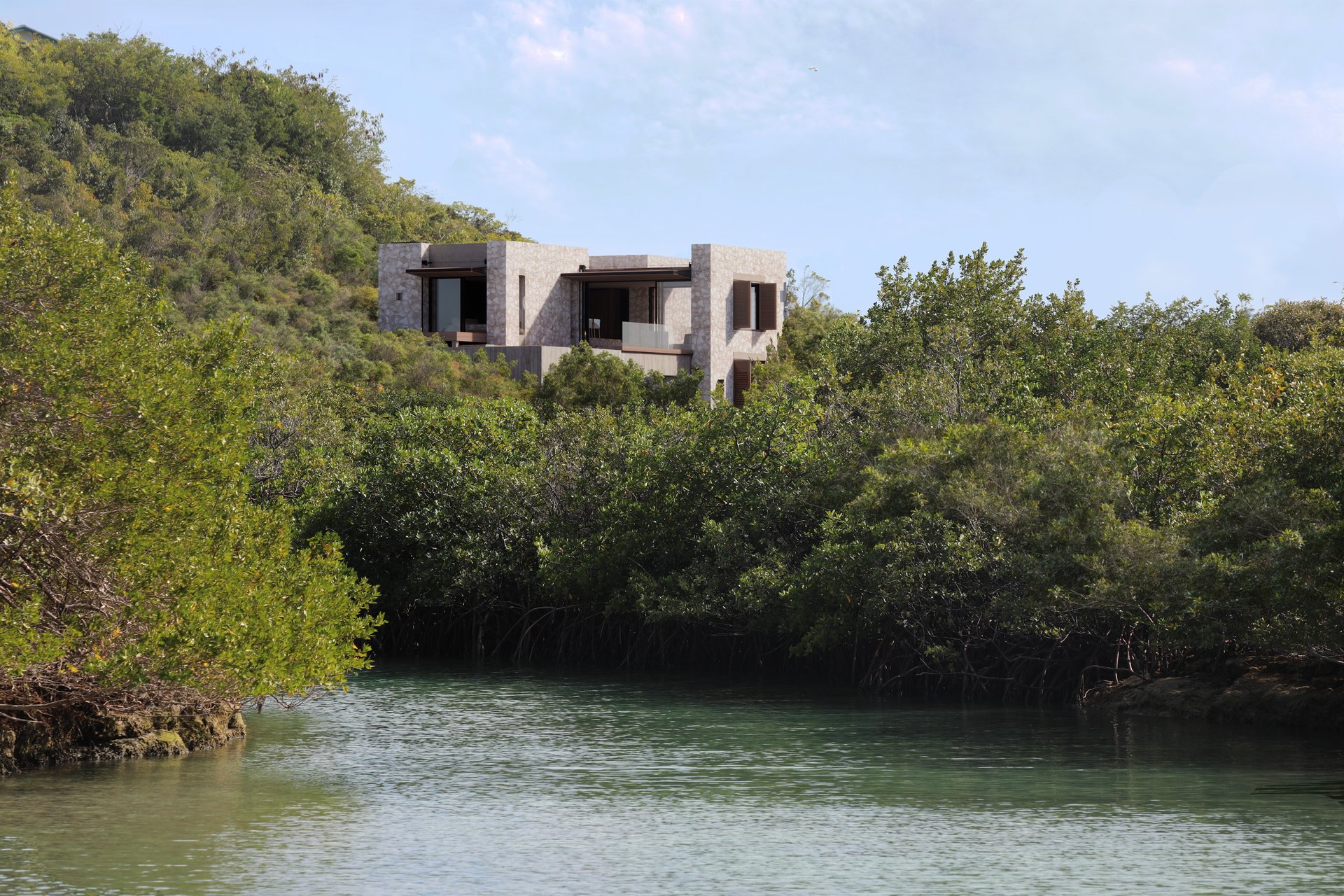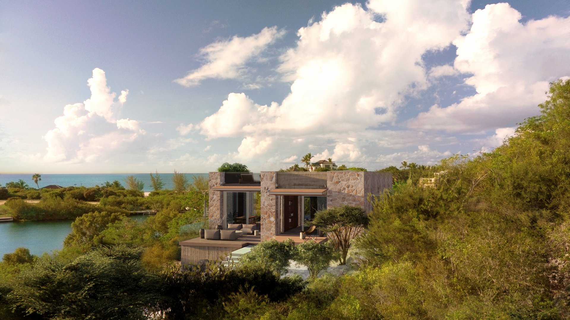 This compact home is located on the edge of a beautiful tidal inlet in the quiet residential area of Thompson Cove. Its elevated location on a steep hillside affords aerial views of the Thompson Cove nature reserve, as well as distant views to the gentle arc of the island’s barrier reef.