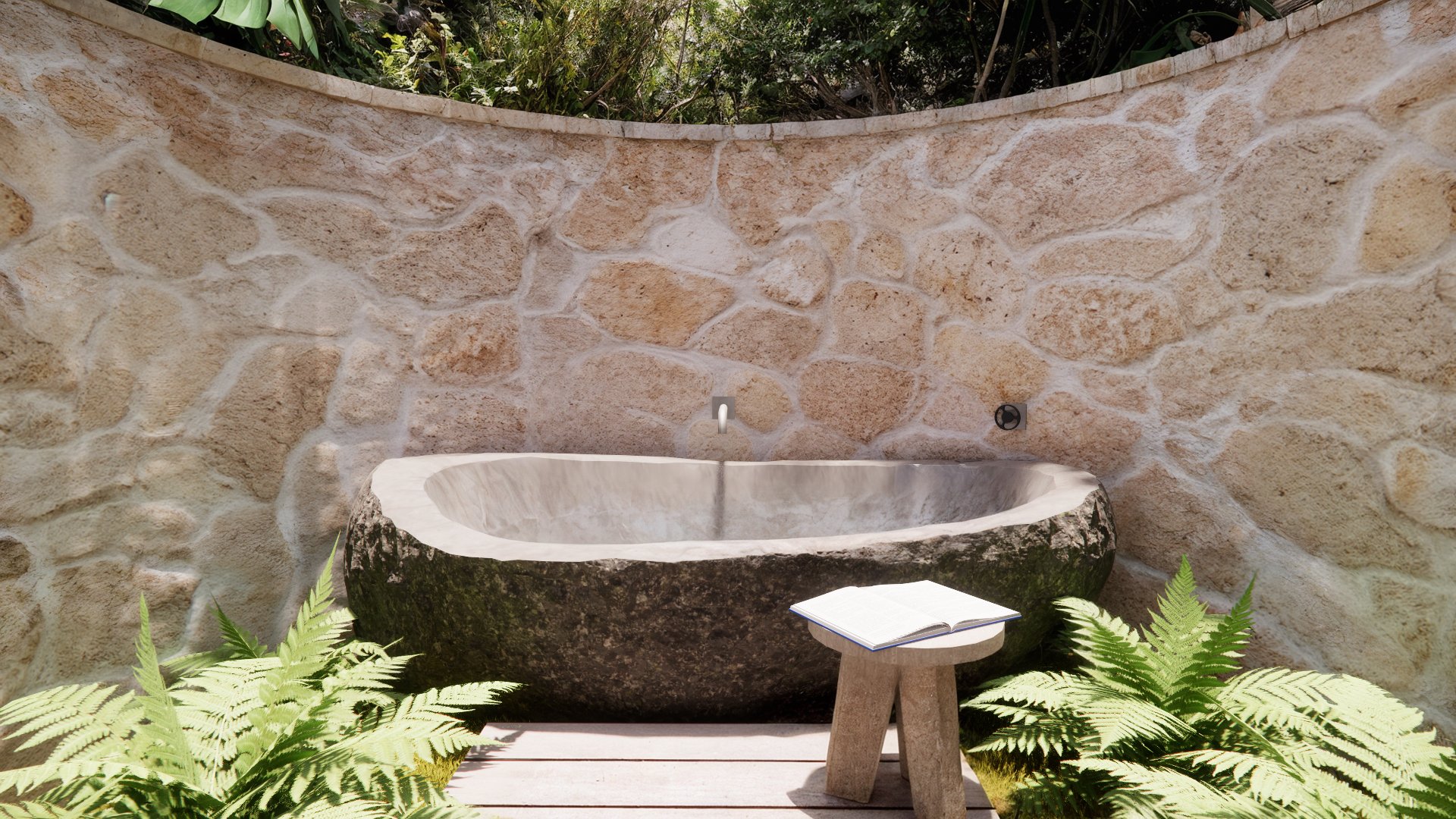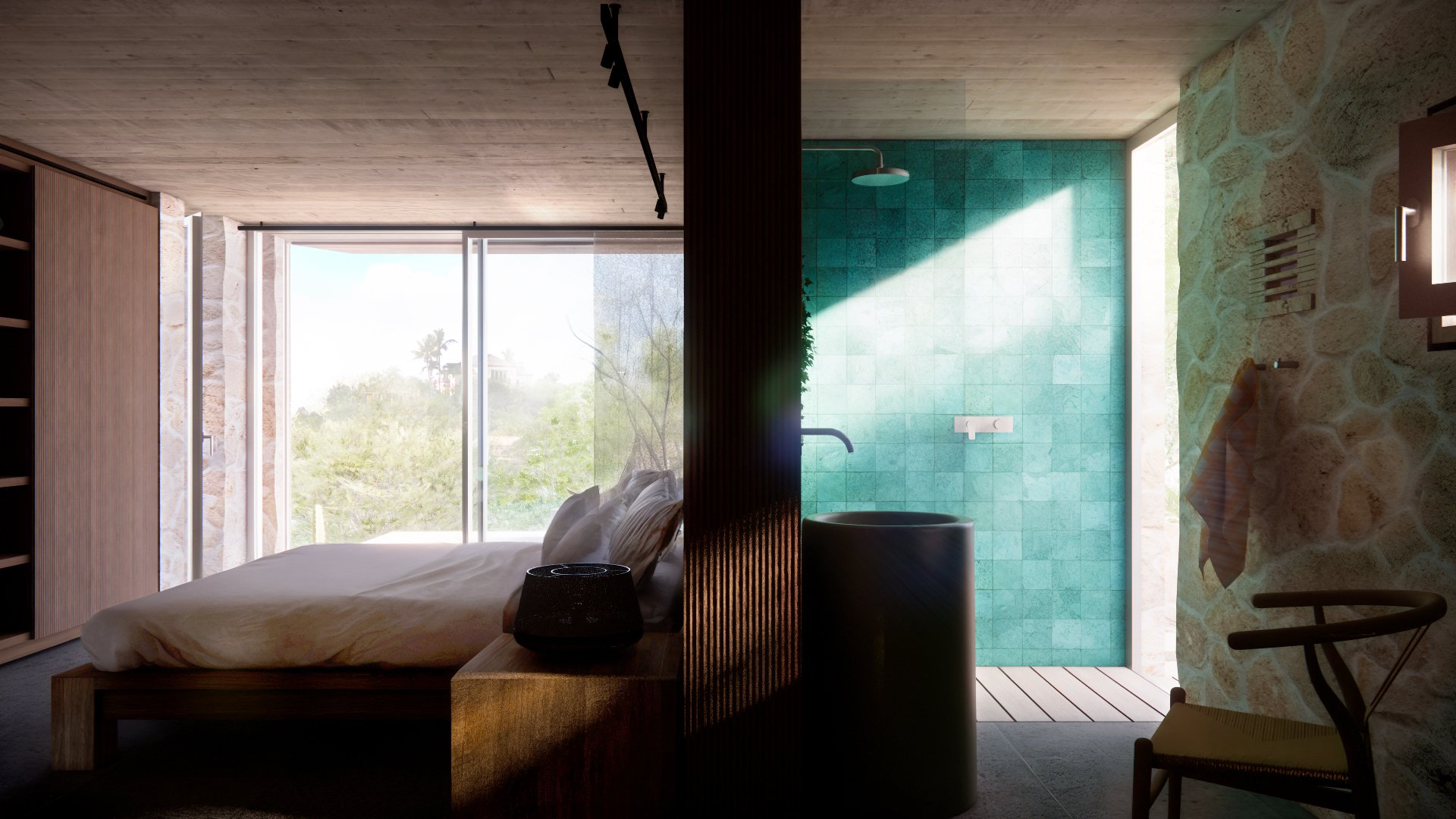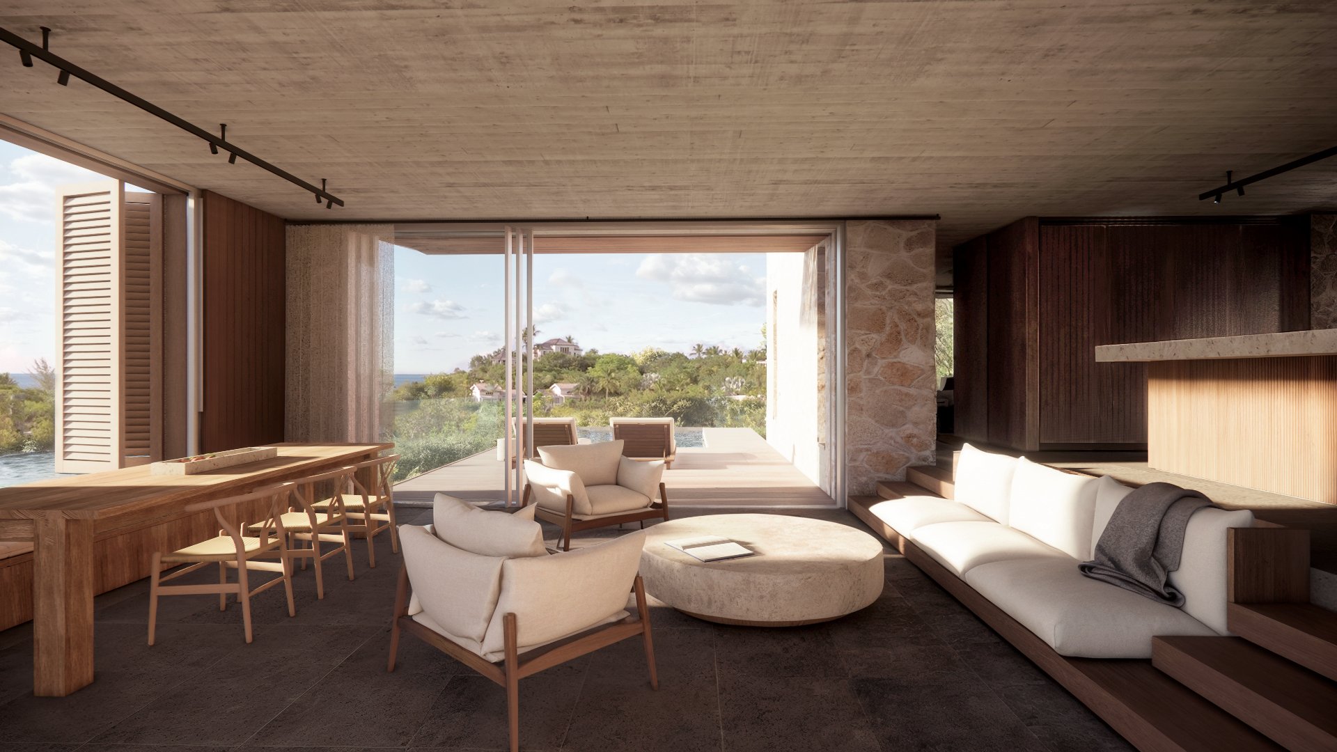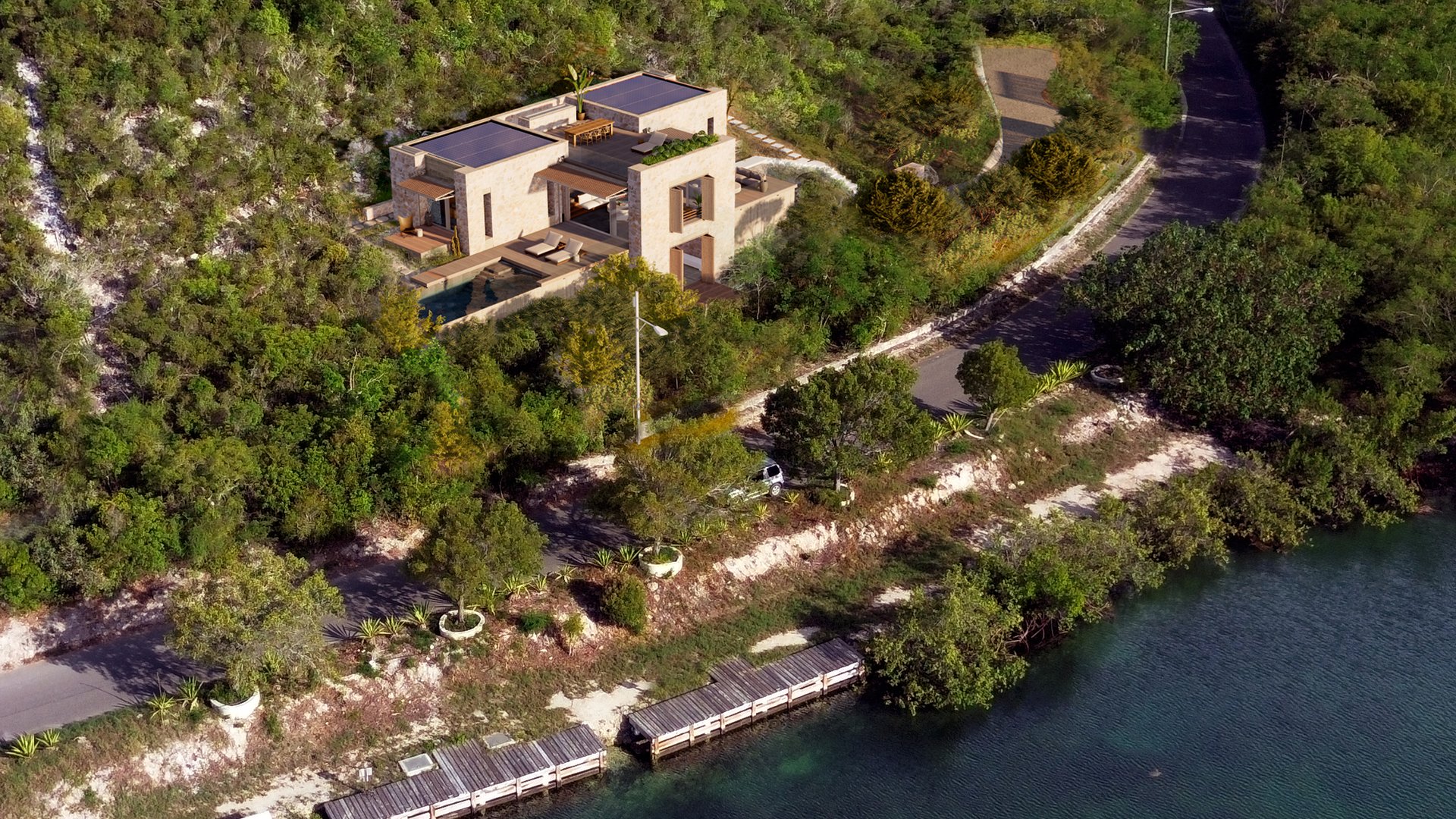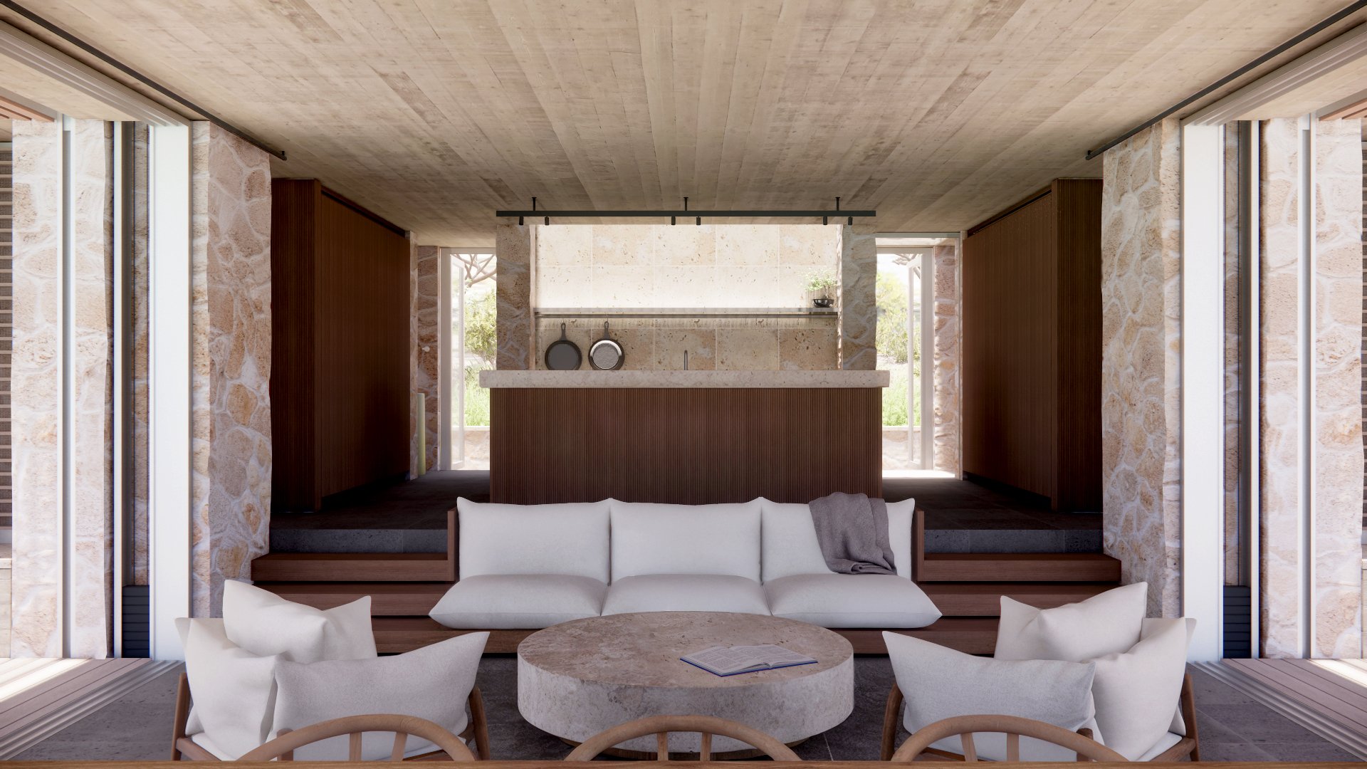 Below the main deck level is a third guest bedroom, with utility room, paddleboard stores and rainwater storage tanks. Above the main deck is a roof terrace with 180 degree panoramic views and concealed solar panels to ensure self-sufficient power generation. At the buildings’ rear sides are two arced cut-outs in the rock for outdoor showering and bathing.