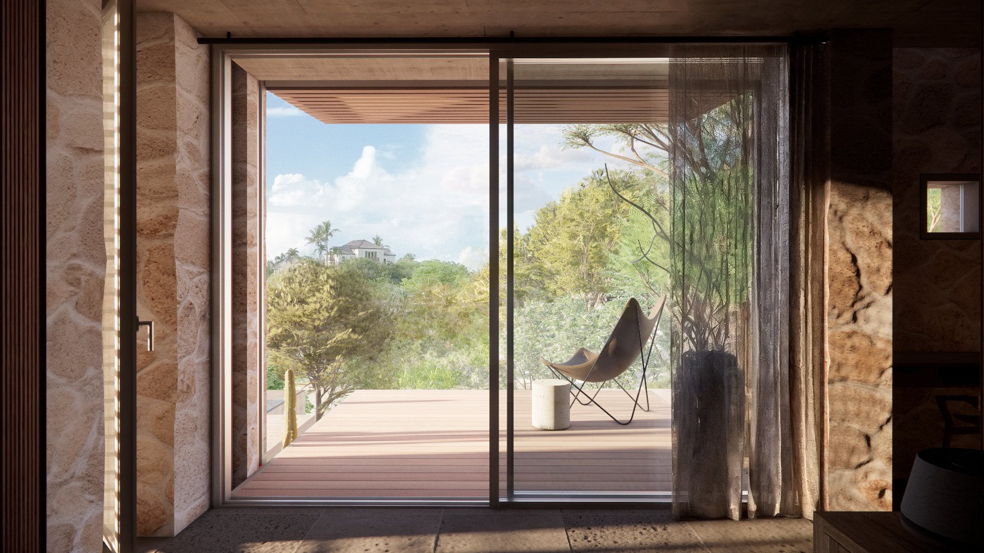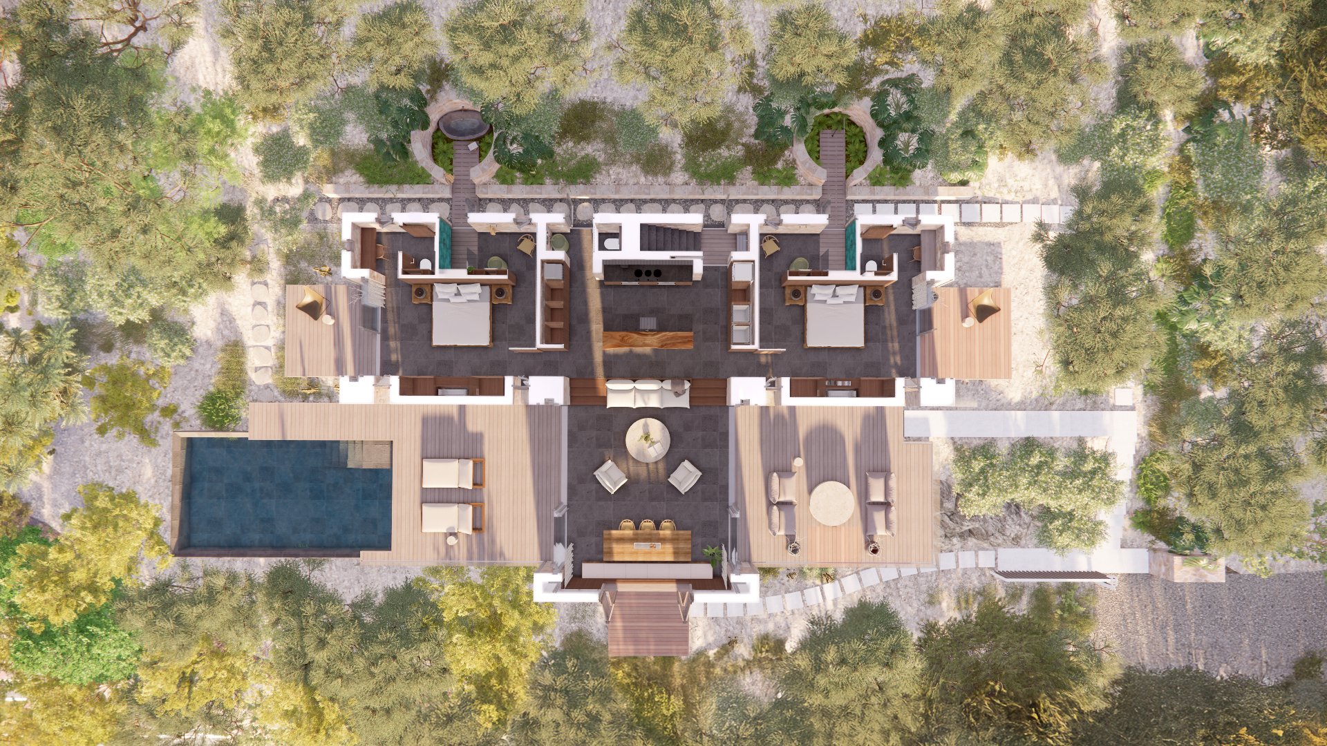 This desire to terrace the home developed a building of two parts, with the two principle bedrooms hugging tight to the hillside, and the living and dining room pulled outward like a drawer to connect with the pool deck and dining terrace, whilst capturing the best views of the meandering creek as its leads to the ocean.