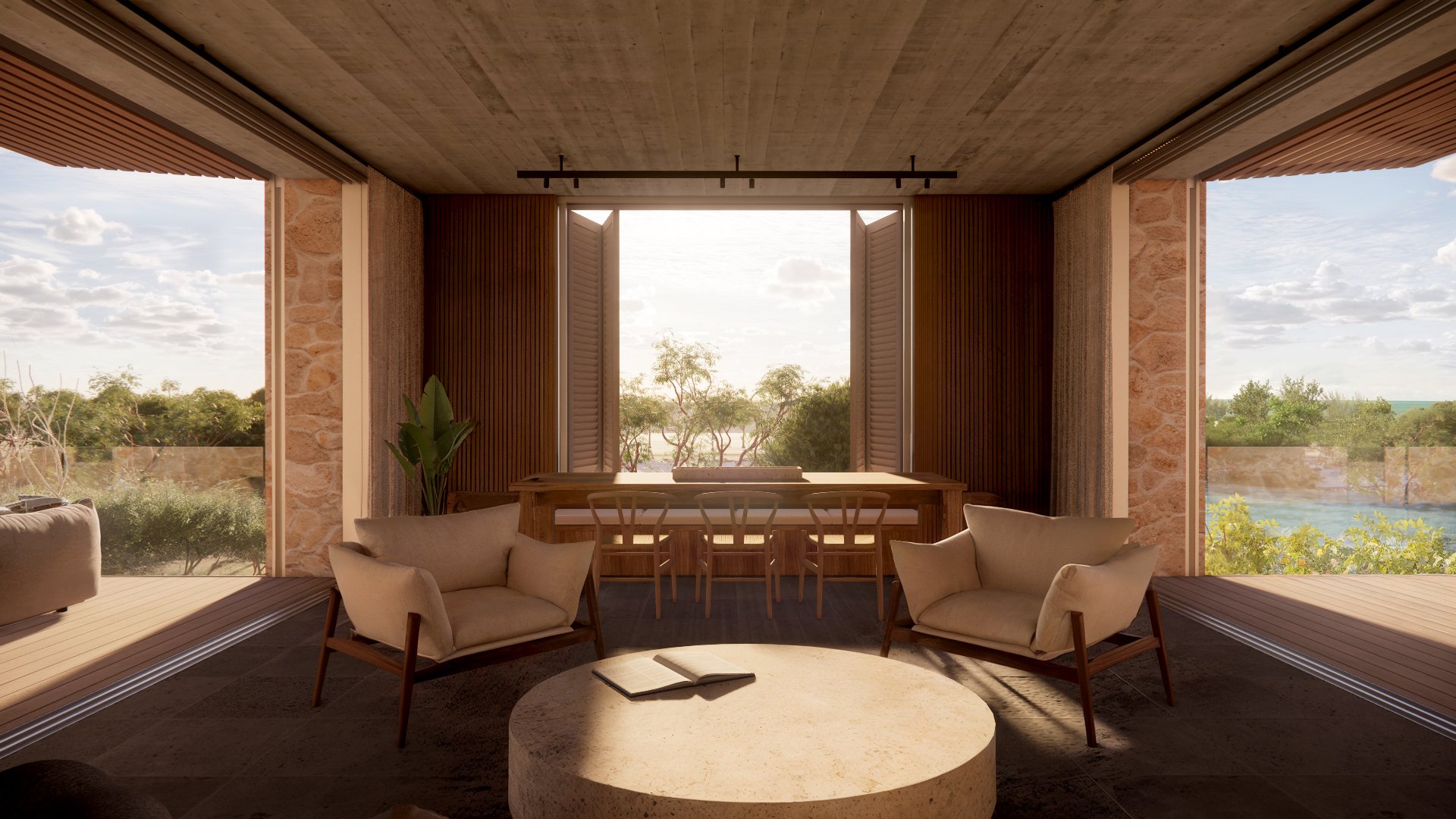 The atmosphere that this home has sought to create is one of a rural retreat. It has natural, exposed finishes throughout the interior, and it is decidedly low-tech. Even the slatted timber awnings that shade the windows will be raised and lowered mechanically by hand. This will be a place for paring back and slowing down.