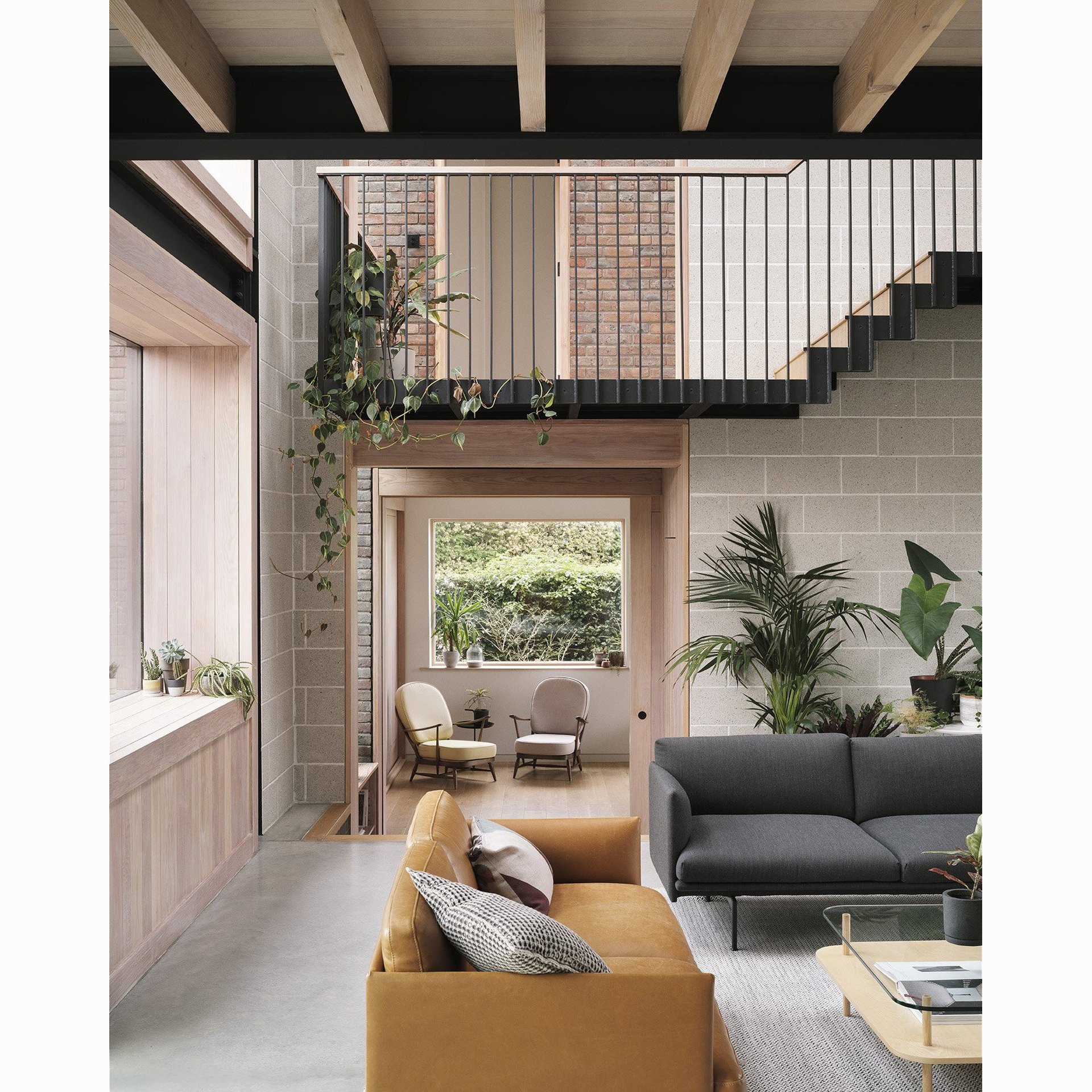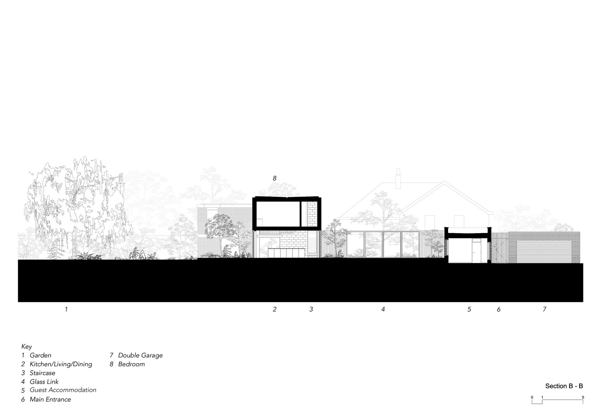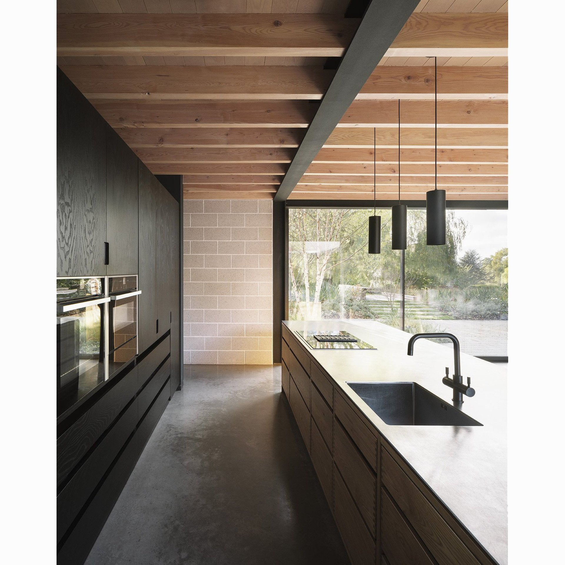 On entry, a utility structure provides guest, garage and boot room spaces and is connected via a long glazed link which is attached to the primary living space - a large open plan volume to cook, eat and gather as a family. Inspired by the utilitarian mill interiors of steelwork and exposed timber beams, this is a space that is intended to be both durable and adaptable. An intricate staircase is tucked in the gap between the primary and secondary accommodation, and is held within the gap to the adjacent building, containing more intimate family spaces and the master bedroom.