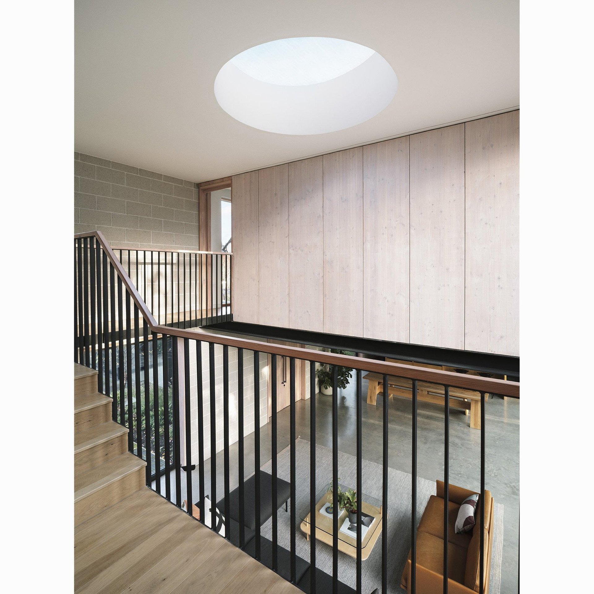 The principle bedroom is entered via a discreet opening in the brickwork wall of the upper level, with the secondary / children's bedrooms simply duplicated and bookended by a family bathroom with views out both north and south across the gardens. This stair rises, breaks out and morphs into a gallery, overlooking a dramatic double height space, which is topped with a circular rooflight - a simple sundial - projecting the passage of the day onto the whitewashed timber walls.