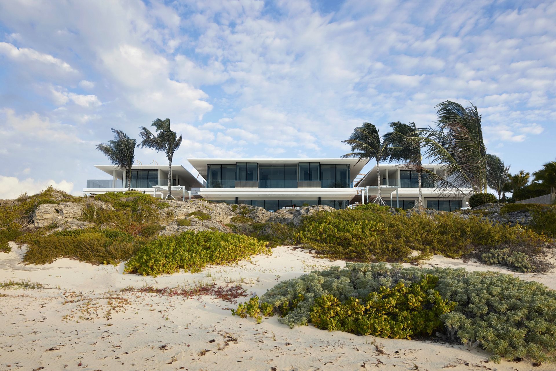 This 10 bedroom home is located on a raised lot at the western tip of Long Bay Beach, Turks and Caicos Islands. The home is positioned at the top of a small cliff of dune grass, with panoramic views looking out across the Caicos Bank. At this elevation, incoming weather patterns can be observed long before they make landfall, with silvery cloud formations reflected on the water below. Capturing the diurnal variances of the sea and sky was central our design ambition, as was careful consideration of the prominence that a house here would have when viewed from the beach below.